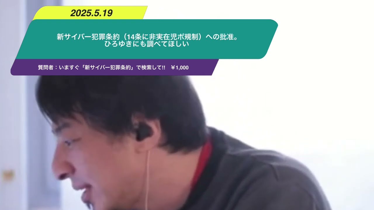 3回目失礼。日本は副議長国として議論を纏めてきた立場上新サイバー犯罪条約(14条に非実在児ポ規制)への批准は既定です。漂白主義的な今の世で作品を守るのは厳しく、いずれ日本中大騒ぎになるので配信を見ている皆さんにもひろゆきにも調べてほしいです。山田太郎議員の尽力で死守した留保規定が無視されれば作品が広範に焼かれ未来永劫触れられなくなります。韓国の事例、児青法のwikiを見れば凄惨さが分かります