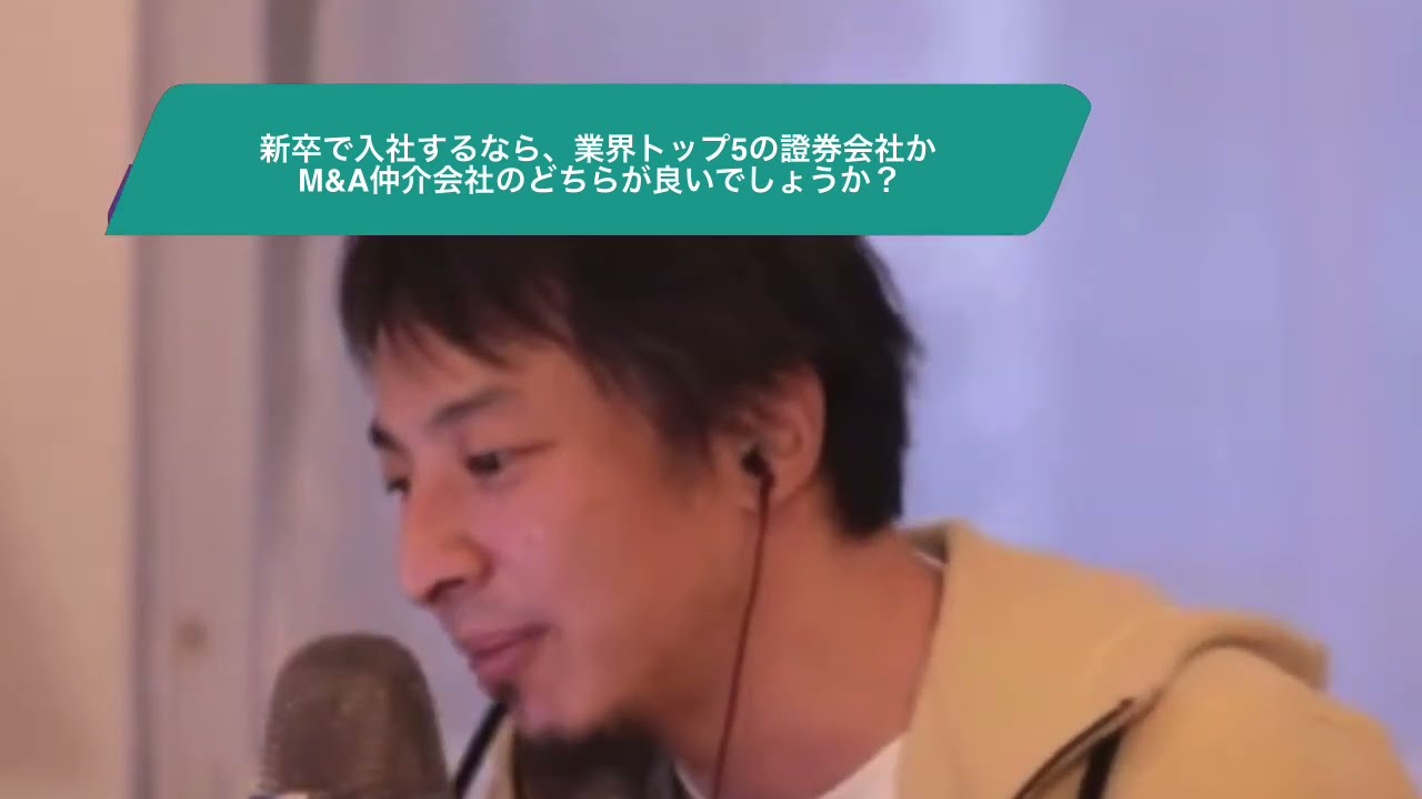 Kind: captionsLanguage: jaえ新卒で入社するのは業界トップ5の証券会社がMA仲介会社メンジ検問どちらがいいでしょうか入れるか別として僕が入るのであればトップ5の証券会社に入りますねあのMA系のところはそれなりな知識があの学べるとは思うんですけどあの野村証券にのず顧客としてずっとい続けてるアホみたいな金持ちの知り合いになれる可能性があるんですよね要はそのあの知識を得るっていうのと金持ちの知り合いを作るっていう2つの要素がその証券会社勤務にあるんですけどであの大手の証券会社に行くとあのすげえ金持ちの知り合いになれる可能性があるんすよ要はその仕事が楽しいかどうかとかその業務のノハがびるかどうかとは別にして金持ちの知り合いが作れるのはどちらですかってなるとまもちろんmiの仲介会社でも作れるかもしれないですけど所詮言うてもあの中金持なんすよ要はそのなんかあのIT系のなんかじゃあの10億円レベルの金持ちはベンチャー企業のとこでもなれるかもしれないけどあの1000億円レベルの金持ちってやっぱり野村証券とかに行かないと知り合いになれなかったりするんですよねなのであの本当の大金無仲良くなりたいんだったらあの昔からある証券会社に行った方がいいんじゃないかなと思います