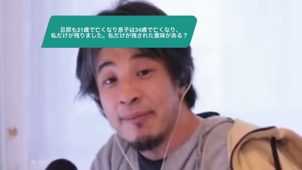 先程はありがとうございました。旦那も21歳で亡くなり息子は34歳で亡くなり、私だけが残りました。私だけが残された意味があると思いますか?ひろゆきさんのご意見お願いします。