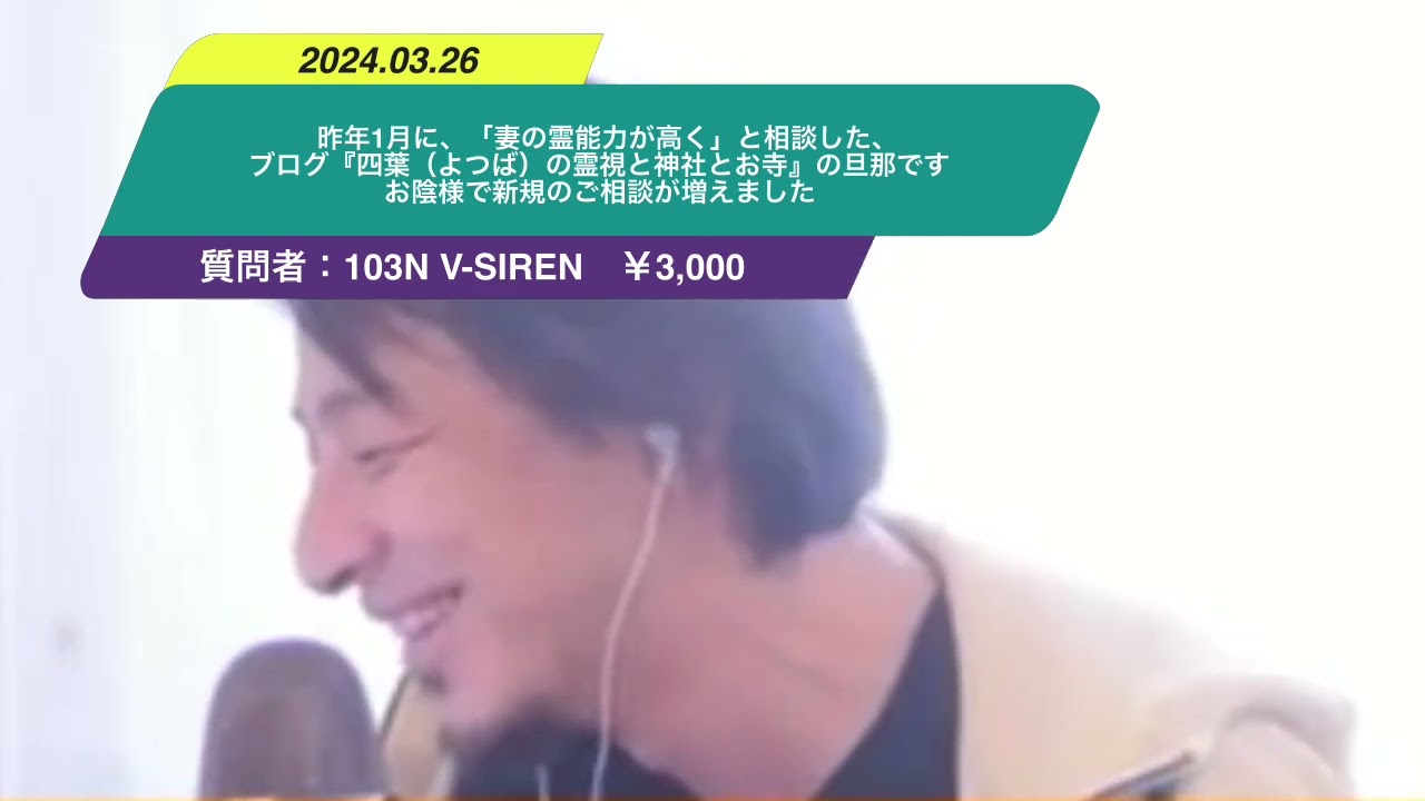 昨年1月に、「妻の霊能力が高く」と相談した、ブログ『四葉(よつば)の霊視と神社とお寺』の旦那です。 その後動画を見た方からの御依頼が増え、いつの間にか切り抜きも5件(うち単独4件)公開されています。お陰様で新規のご相談が増え、休日のみの受付の中、30件以上の方がひろゆきさんの動画から御依頼され、全ての方にご好評頂いています。ありがとうございます。これからも精進致します。またご連絡します。