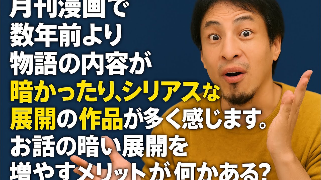 最近プラネタリウム見る前に広告流れてびっくりしました。21歳学生です 最近のアニメや週刊サンデーやジャンプ、月刊漫画コロコロ等を見てると、数年前より物語の内容が暗かったり、シリアスな展開の作品が多く感じます。お話の暗い展開を増やすメリットが何かあるのでしょうか。 ひろゆきさんのご意見お待ちしています