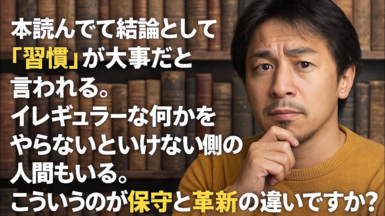 やや抽象的ですが、本読んでて結論として「習慣」が大事だと言われると絶望感を感じます。というのは、習慣として昔から何かをやってた人間が必ず勝つのであり、遅ればせながら参入したような新しい人間がそれに追いつくことは不可能だ、ということを肯定するように聞こえるからです。習慣的にやっても埒が明かないのでイレギュラーな何かをやらないといけない側の人間もいると思ってしまう。こういうのが保守と革新の違いですか?