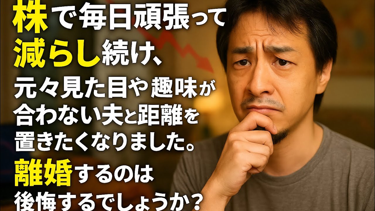 夫が設計の仕事を辞め、デイトレやり始め5年ほどになります。しかし、貯蓄数千万減らし、そろそろ生活に困る程になりました。 金の切れ目が縁の切れ目とは思いたくはないのですが、それでも株で毎日頑張って減らし続け、元々見た目や趣味が合わない夫と距離を置きたくなりました。 結婚して10年程になりますが、こんな事で離婚するのは後悔するでしょうか?自分でも良く分かりません。