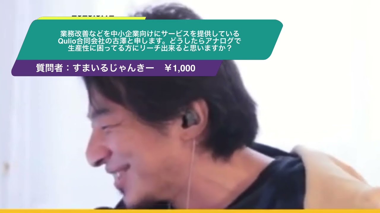 ひろゆきさんこんばんは!私は業界を問わない業務マニュアル作成や、製造業に対して品質目線で無理のない業務改善などを中小企業向けにサービスを提供しているQulio合同会社の古澤と申します。こういったサービスはどのようにしたら、アナログで生産性に困ってる方にリーチ出来ると思いますか?ご意見お願い致します!