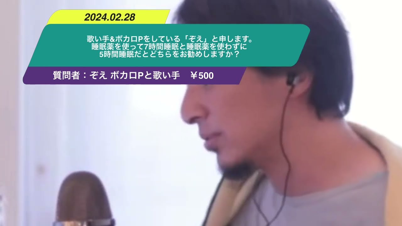 歌い手&ボカロPをしている「ぞえ」と申します。睡眠薬を使って7時間睡眠と睡眠薬を使わずに5時間睡眠だとどちらをお勧めしますか?