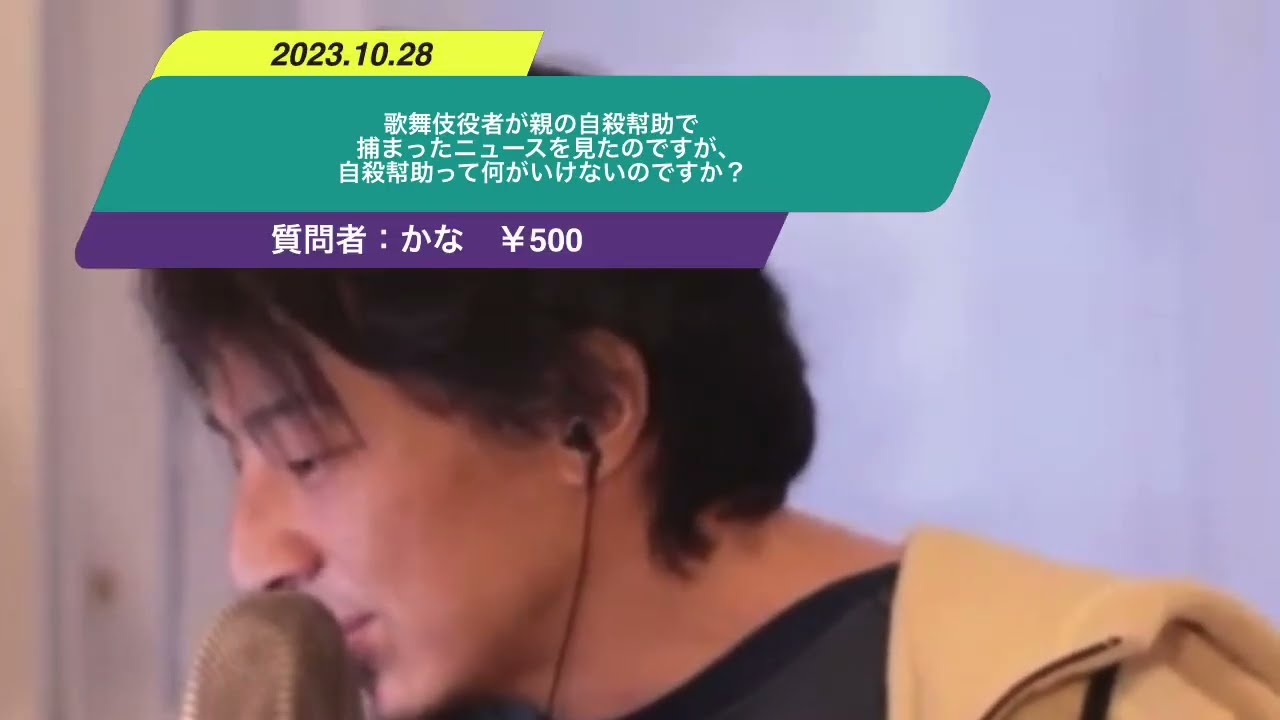 Kind: captionsLanguage: jaえ少し前に歌舞伎役者が親の自殺補助で捕まったニスを見たのですが自殺補助って何がいけないのですか死た人を鬼に生かすよりらにあげる方がその人のためになる思いますかまそうなんですけどあの自殺法主なのか殺人なのか区別がつかないんですよ要はそのま僕の死んだ魚を目をしてる性格の悪い親をが自殺したいというので手助けしたんですっていうので自殺補助しましたって人が実はこの親マジむかつくからぶっ殺したっていうのと区別がつかないんですよなので区別をつけられないから自殺補助というのを許してしまうと殺人子放題になってしまう可能性があるのでなので自殺補助もちゃんとあの制限するよって話なんじゃないかなと思います