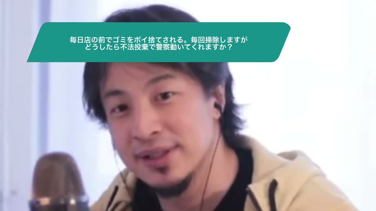 Kind: captionsLanguage: jaえ毎日店の前でゴミをポされています毎回掃除しますがどうしたら不法登記で警察動いてくれますかほぼ無理ですあの結局そのカメラで撮影してでその個人を特定してでその人に対してもう弁護士が内容書の送るとかっていうのをしない限りは平治事件で動いてくれる可能性はほぼないと思います残念ながらそれは民事だよねってなる確率が高いんじゃないかなと思いますけどそれでも防ぐのであればその店舗の前に絨毯かなんか置いといてでそれでポイ捨てされることによってその絨毯にシミがついてしまいましたっていうのでその地物損害みたいな形でやるのがま可能か不可能かで理論上可能かもしんないですけどやっぱりでも警察は動いてくれないと思いますけど