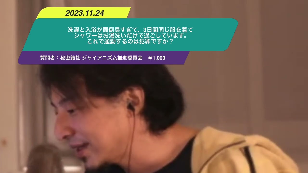 Kind: captionsLanguage: jaえ洗濯と入浴がめどくさくすぎて3日間同じ服かこ下を服もきてシャワーをお洗いだけで過ごしていますこれで通勤するのは犯罪ですかまでも文句言われなきゃいいんじゃないですか僕も別にそんな頻繁にお風呂入んないですよ