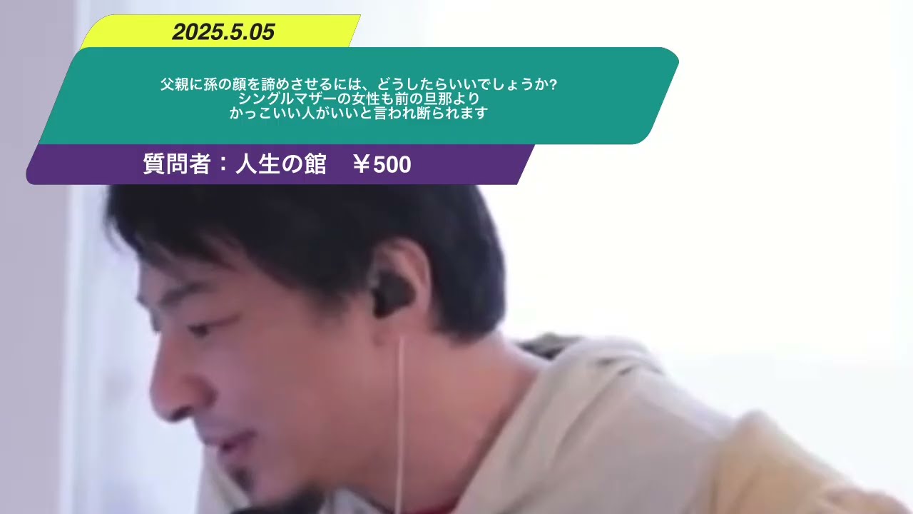 【ひろゆき】父親に孫の顔を諦めさせるには、どうしたらいいでしょうか? シングルマザーの女性も前の旦那よりかっこいい人がいいと言われ断られますー ひろゆき切り抜き 20250505