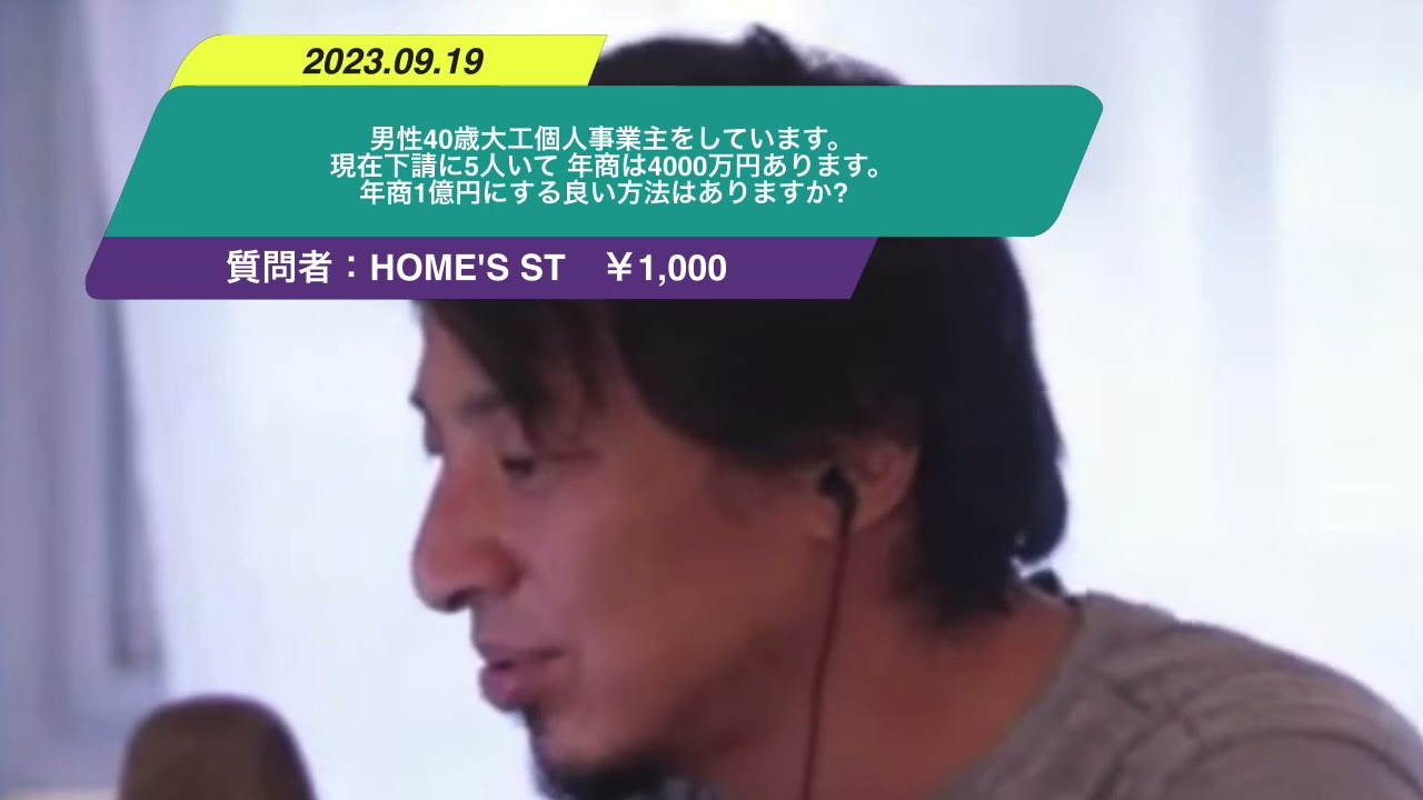 Kind: captionsLanguage: jaえ男性40歳大工個人事業所しています現在下請けに5人いて年少は4000万あります年少1億円にするよい方法はありますか下請を10人に増やせば8000万になると思います要はあの年少自体を増やしたいのであれば自分自身が働くのでなくいかにあのごく下請けをいっぱいあのそのコントロールするかっていう方で増やしていがいいと思うのでなので下請けを増やしてください