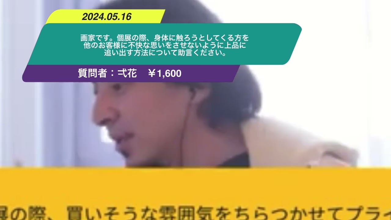 Kind: captionsLanguage: jaえ画家です古典の際回想な雰囲気をちらつかせてプライベートな会員をしたり女性え体に触ろうとしてくる方いわゆるギャラリーストーカーを他のお客様に不快なものさせないように上限の出て受験いただけないでしょうかいつも1人になるタイミングを狙われて困ってますえっとあの知り合いの男の人にお金を払ってガードマン的なのやってみてもらってくださいまあの割とそのま恋人がいるんだったらこですけどあの知り合いのなんか男性とかに受給1000円ぐらいであのそういう人が来たら追い払うっていうバウンサーの役目をあの自分でやっちゃうとやっぱり角が立つのでなんでそういうガードマン的な役割というのをあの雇った方がいいんじゃないかなと思いますけども
