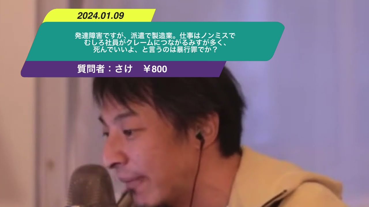 Kind: captionsLanguage: jaえ発達障害ですが派遣で製造業してます仕事は飲ミスてむしろ社員がクレム繋がるミスが多く死んでもいいよというのは暴行剤ですか暴行剤ではないんですけど死んでもいいよって会社で言うと割とトラブルが起こってこんなんかトラブルを起こすあいつはやっぱり発達障害のせいだよねみたいな発達障害だから悪いみたいになると思うので言っちゃいけないって分かってるんだったら言わない方がいいすよはいえっと僕会社員じゃないので言いたい放題言ってるんですよまその会社の中では言うべきではないことって僕言わないんですよ一応僕も会社の経営やってたりとかあのなんか会社に所属するような形で仕事をしたりってすることあるんですけどその場合はちゃんとあの僕抑えてるんですよ言うべきことと言わないべきことっていうのをわきまえてなのであの自由に話してる時っていうのはまこういう状況だと自由に話てるんですけどあの普通にその組織に入ってる時はちゃんとあの組織の中で許される範囲ないで発言をするっていうのやったりするのでだそこのTPOをわきまえた方が社会ではうまく立ち回れるんじゃないかなと思いますけども