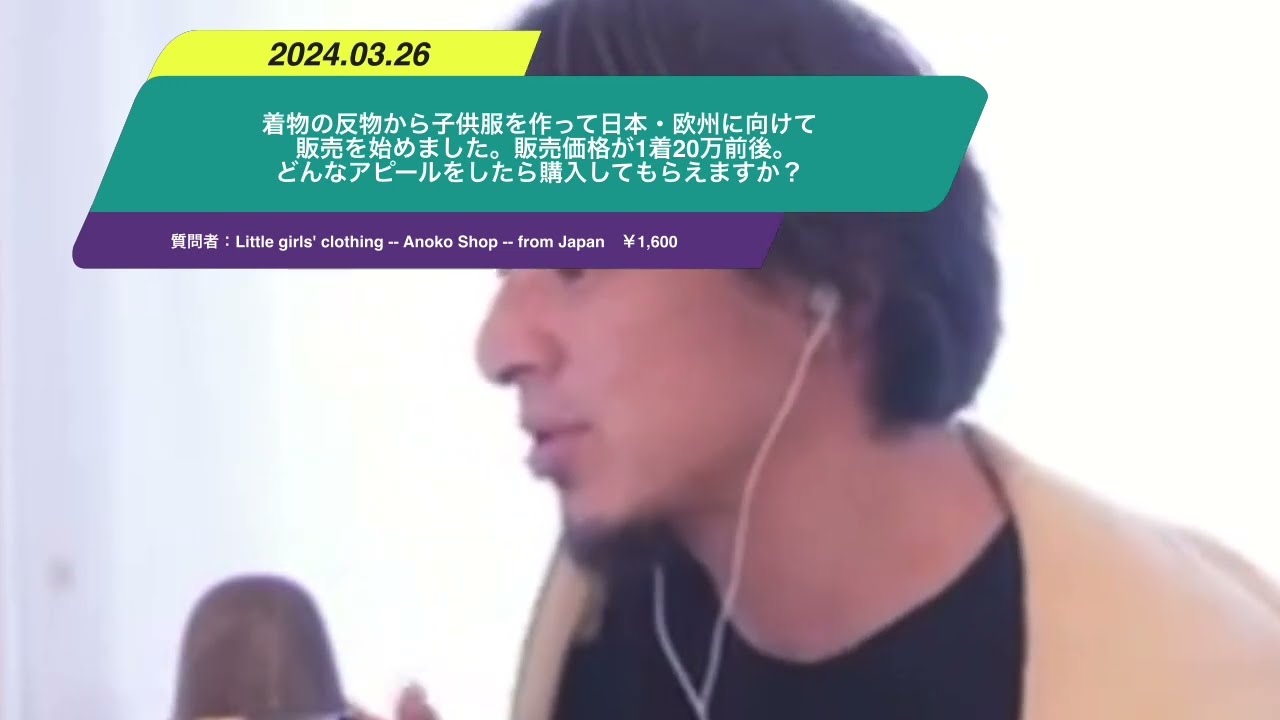 Kind: captionsLanguage: jaえ日本の売り物は素晴らしいと思っていて着物の端物から子供服を作っ日本温州に向けて販売を始めました中古の着物のリメイクではなく端物からつくるので販売価格が1着20万前後になってしまいますどんなアピールをしたら購入してもらえますかアバスお願いします日本の物の存続に寄与したいし素晴らしさを世界に伝えたいですえっと静止がではなくて動画で作ってあげてくださいやっぱりそのあの基地の質感ってその静止画の写真だと伝わらないですよね動画で動いたりするとその光の光沢によってあこういうはキとかって写真で撮ると分かんないですけどやっぱあの見れば光沢って分かるじゃないですかでなんで見れば分かるかって言うとそのやっぱ動画と一緒でその動いた時のその光の動きとかで光沢って感じるのでなのでなるべく動画でプロモーションするっていうのやればいいんじゃないかなと思います