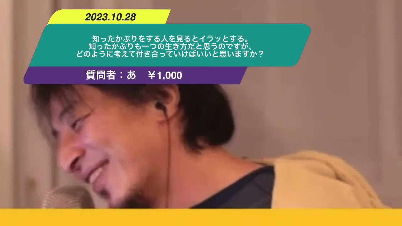 知ったかぶりをする人を見るとイラッとしてしまい「努力はしたくないが、努力している人と同等の評価を受けたい卑怯者」と思ってしまいます。先日後輩が「CPUにi5と書いてあるのは第5世代なので相当古いCPUです!」と朗々と説明し、それを信じた他の人が「彼はパソコン詳しくてすごいね!」と言っていました。知ったかぶりも一つの生き方だと思うのですが、どのように考えて付き合っていけばいいと思いますか?