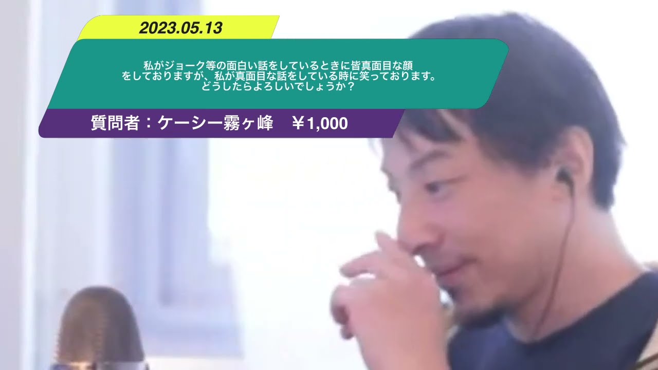 Kind: captionsLanguage: jaえ普段会社員をしております私がジョークなどの面白い話をしてる時にみ真面目な顔しておりますが私が真面目な話をしてる時に笑っておりますどうしたら言うんでしょうかえ別に全然いいんじゃない特に何の問題もないんじゃないかなと思いますけどなんでそれがこうどうしたらいいいや別になんか面白い話をしててみんなが真面目な顔してるし真面目な顔してるし真面目な暗してる時に笑ってるで仕事として何度問題もないのであればそれは何も問題がないですあの要はその業務上どういう顔をしてるかとかでなんか給料が下がりますとか首になりますとかお客さんが起りましたとかであればそれは問題かもしれないですけど何の問題もないですなので別に好きにすればいいじゃないかなと思いますけど
