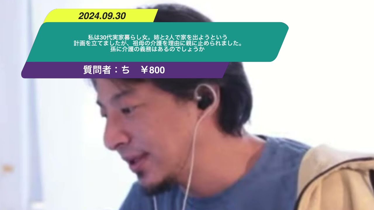 私は30代実家暮らし女です。姉と2人で家を出ようという計画を立てましたが、祖母の介護を理由に親に止められました。孫に介護の義務はあるのでしょうか。このまま家を出たら親と縁が切れるのではと思い、中々出づらくて困ってます。ですが、父には無視されているので家にも居づらいです。ひろゆきさんならどうしますか。