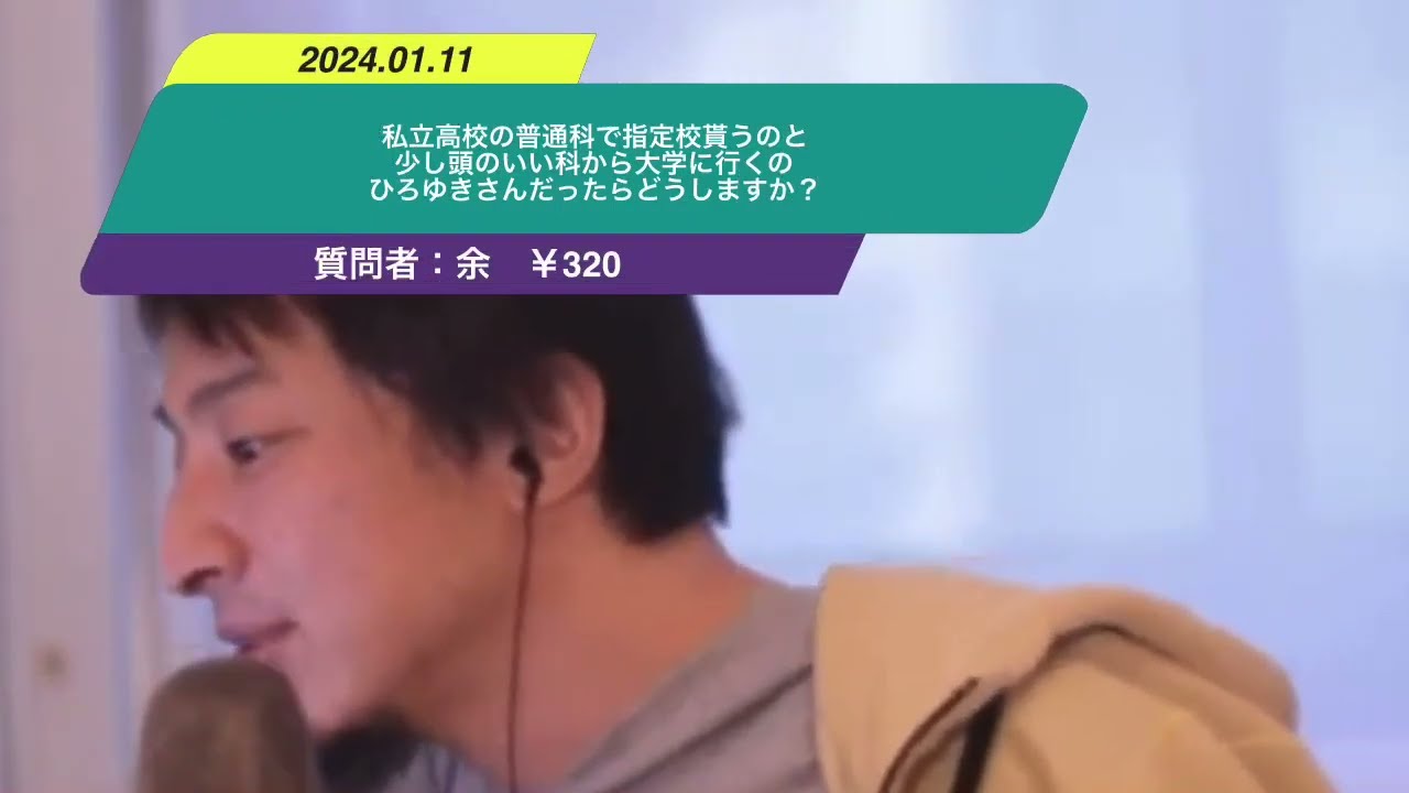 私立高校の普通科で指定校貰うのと少し頭のいい科から大学に行くのひろゆきさんだったらどうしますか?元動画:能登半島に最大同時接続✖️30円の寄付をするよ、その2。ジョージアワインを呑みながら。2024/01/11 J22