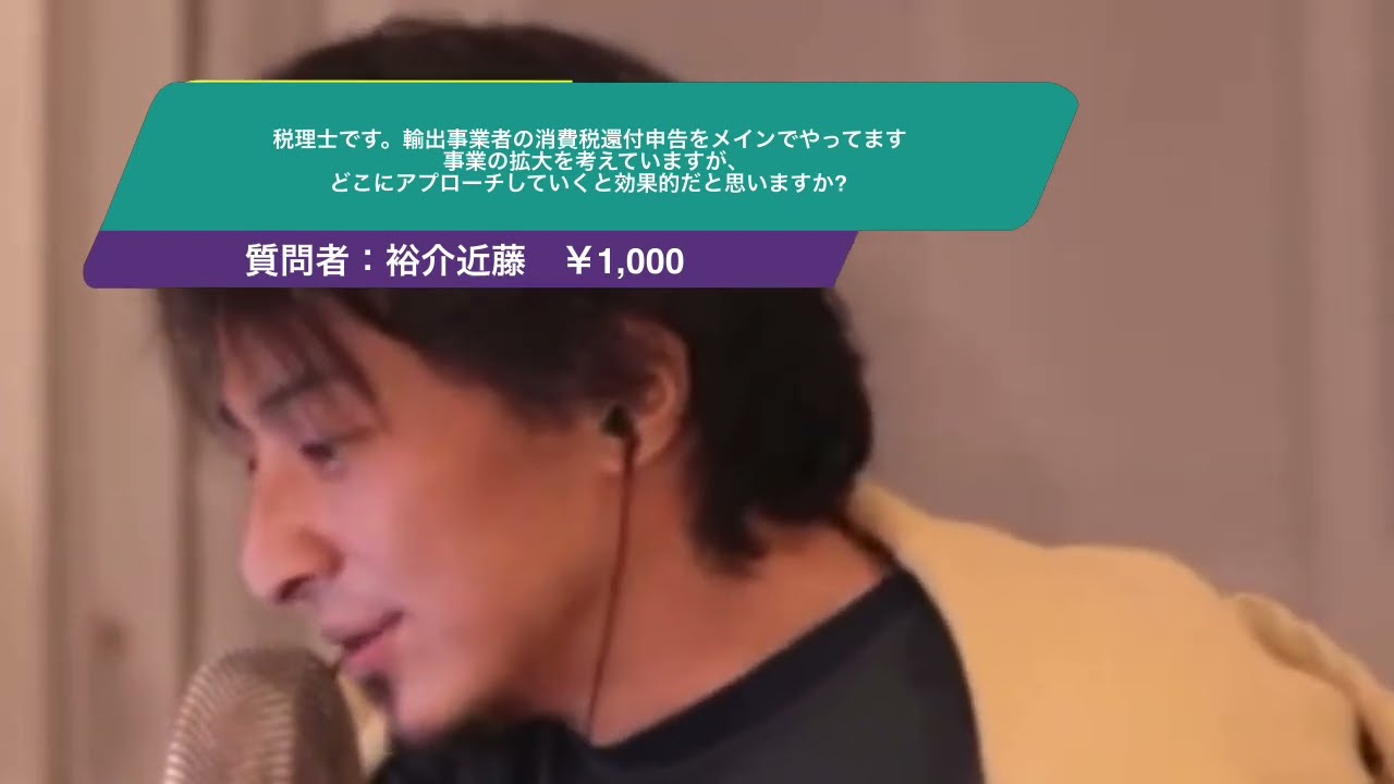 税理士です。いつも楽しく聞かせてもらってます。 輸出事業者の消費税還付申告をメインに取り扱っております。 顧問業ではなくスポットでのサービスを展開中です。 事業の拡大を考えていますが、どこにアプローチしていくと効果的だと思いますか?