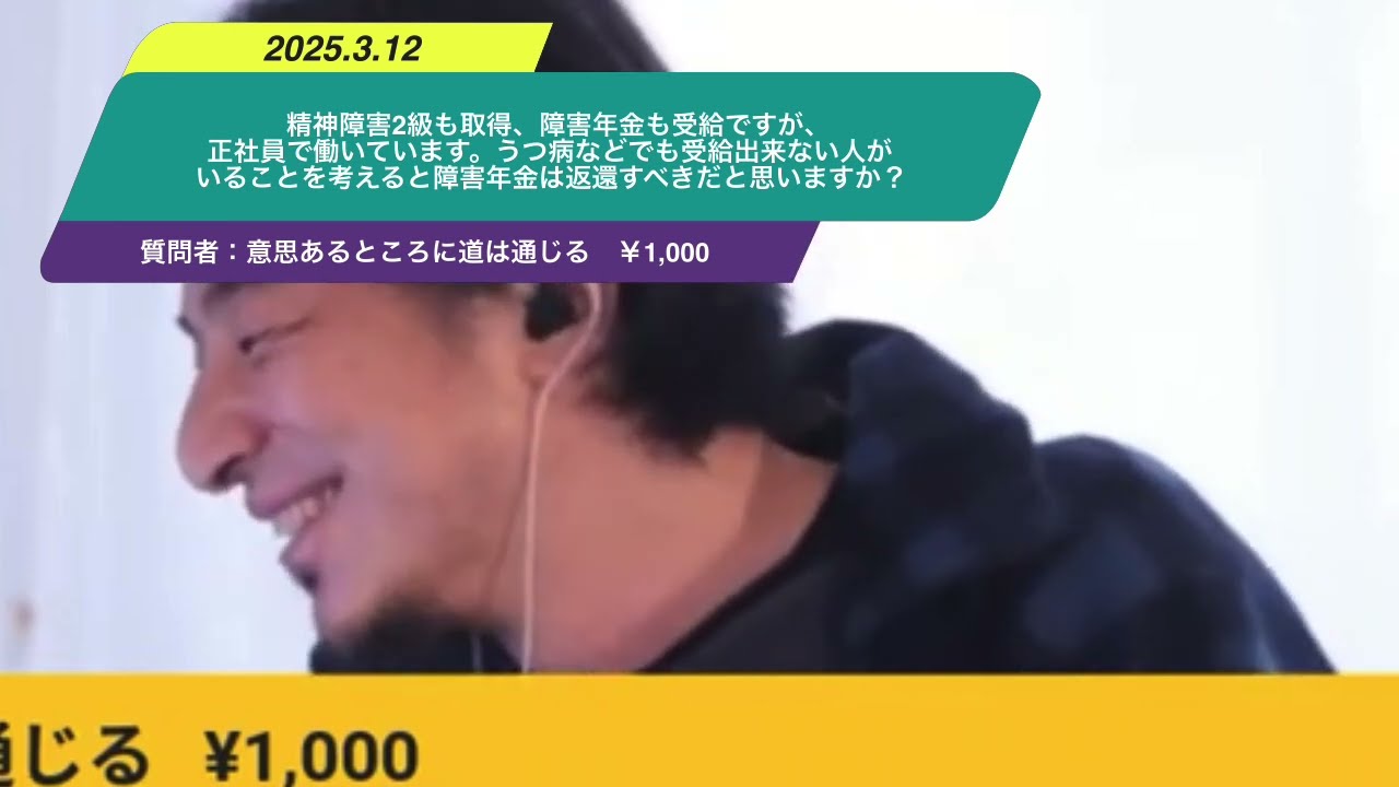 【ひろゆき】精神障害2級も取得、障害年金も受給ですが、正社員で働いています。うつ病などでも受給出来ない人がいることを考えると障害年金は返還すべきだと思いますか?ー ひろゆき切り抜き 20250312