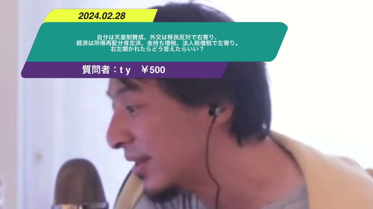 Kind: captionsLanguage: jaえ自分は天皇生産性外交は移民反対で右寄りなのですが経済や所得裁半分工程派金持ち増税法人税増税で左寄りなんですが左右聞かれたらどう答えたらいいですか右とか左とかで簡単に物事を決めようとする人って頭が悪いですよねって言えばいいんじゃないですか要はその右の人はみんなこういう考えをするこのいう考えをする人はみんな左であるみたいなそこら辺の考え方ってまその戦後とかであればそうかもしんないですけど今の時代その考えって人によって全然違うんですよねいやあの保守って言ってる人でもアメリカ大好きって言ってる人もいるしなので割とそのあの人によって考え違うのでなんかこの考えをしてるからじゃああなたは右なんだならばこうだろうみたいなのを決めつけるっていうのは頭の悪い人がやることなのかなと思うんですけども