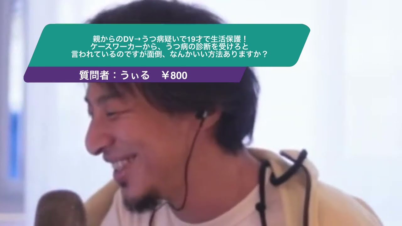 Kind: captionsLanguage: ja[音楽]え親からDVうつ病歌で19歳で生活音が取れましたケースワーカーからうつ病の診断を切ろと言われてですが面倒です何かいい方法ありますかうつ病の診断受けろ以上ですえとあのうつ病であるという証明ができてないとこの人はうつ病じゃなくて単にうつ病だと言っている19歳の人なんじゃないのDVと言ってるだけの人なんじゃないのという疑いがあるとそれは要は主張してるだけでDVもされてないしうつ病でもありませんなので生活保護を打ち切りますという判断を役所が可能になってしまうんですよそのあの誰でも言ったことを信じてお金を出しますっていうのはさすがに無理なのでやっぱりある程度客観的証拠が必要だよねっていうのは役所の側も必要なんですよなのであの面倒だと思えばそのままぶっちぎって生活保護を打ち切られてま普通に働くっていうコースもあると思うんですけど診断受けた方が楽だと思うのでちょっと診断受けてください役所の方もあのその方が作業しやすいです
