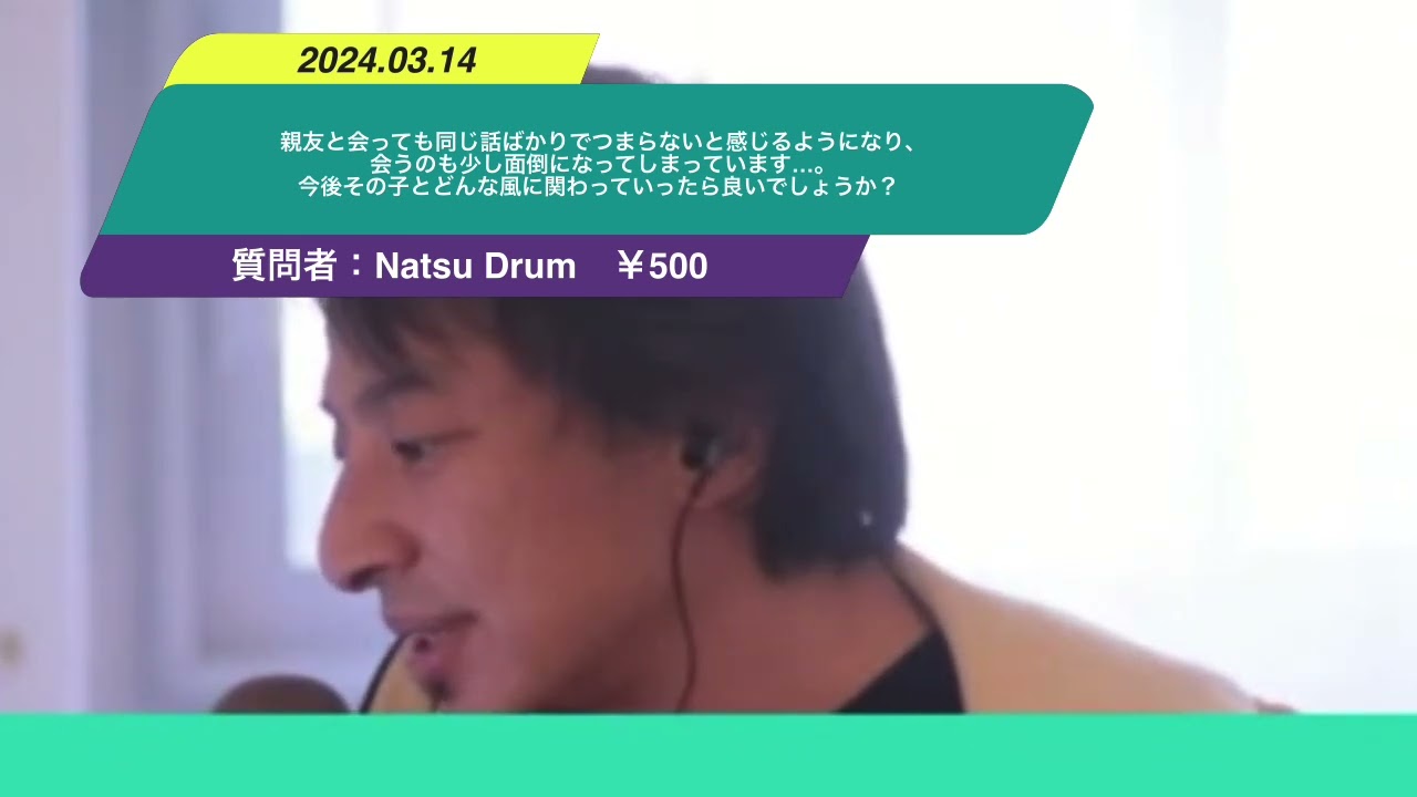 いつも配信楽しみにしています!私には昔からの親友がいるのですが、最近その子と会っても同じ話ばかりでつまらないと感じるようになり、会うのも少し面倒になってしまっています…。でも、その友達のことは好きなので大事にしたい気持ちはあります。今後その子とどんな風に関わっていったら良いでしょうか?
