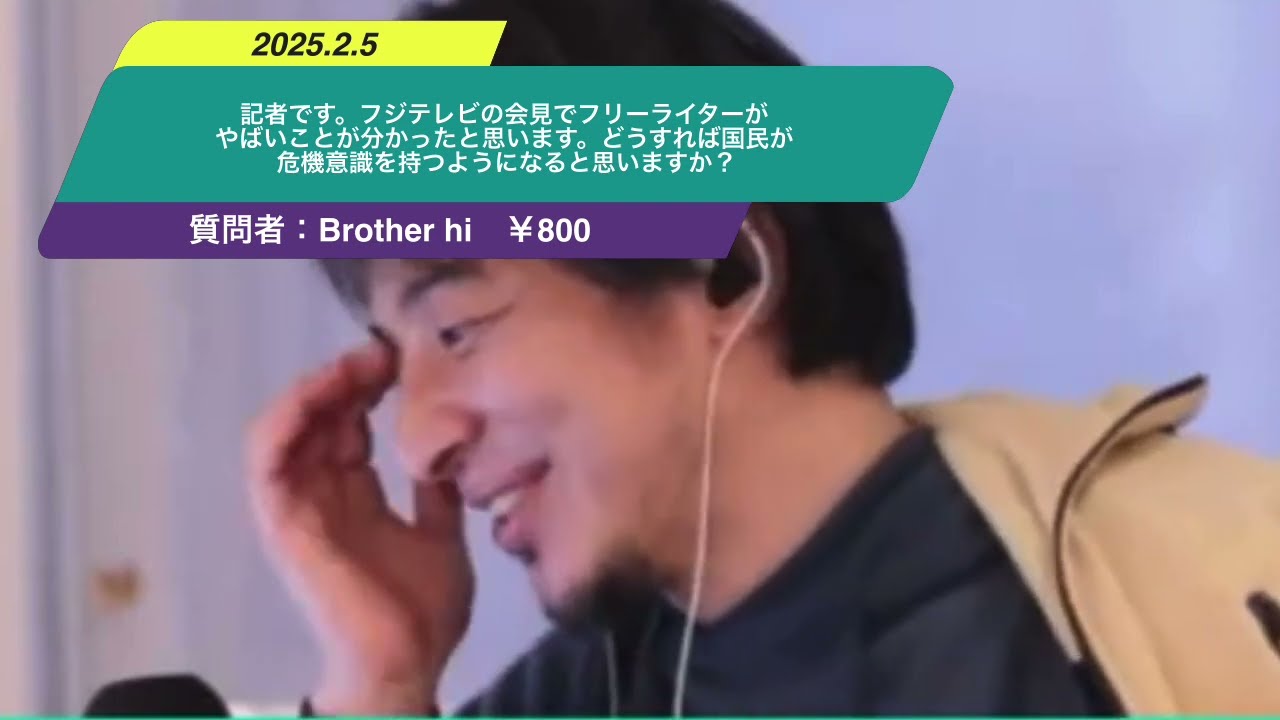 全国紙で記者をしています。フジテレビの会見を観た多くの人々がフリーライターがやばいことが分かったと思います。しかしオールドメディアが稼げなければ全ての記者会見があのような無法地帯になってしまいます。どうすれば国民が危機意識を持つようになると思いますか?