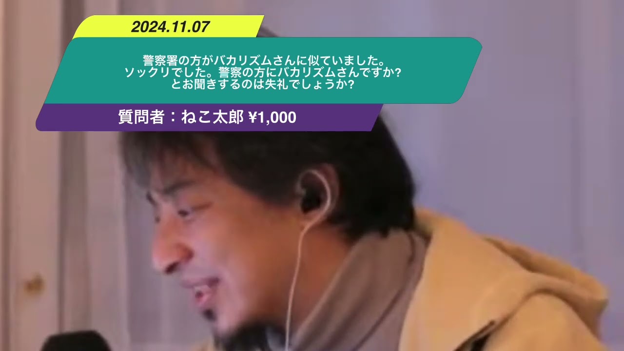 【ひろゆき】警察署の方がバカリズムさんに似ていました。ソックリでした。警察の方にバカリズムさんですか?とお聞きするのは失礼でしょうか?ー ひろゆき切り抜き 20241107