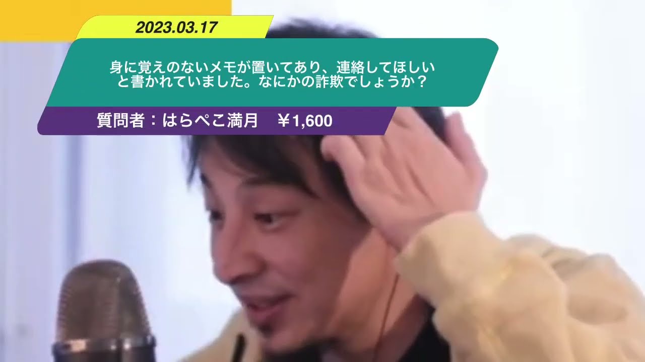 【ひろゆき】身に覚えのないメモが置いてあり、連絡してほしいと書かれていました。なにかの詐欺でしょうか?ー ひろゆき切り抜き 20230317