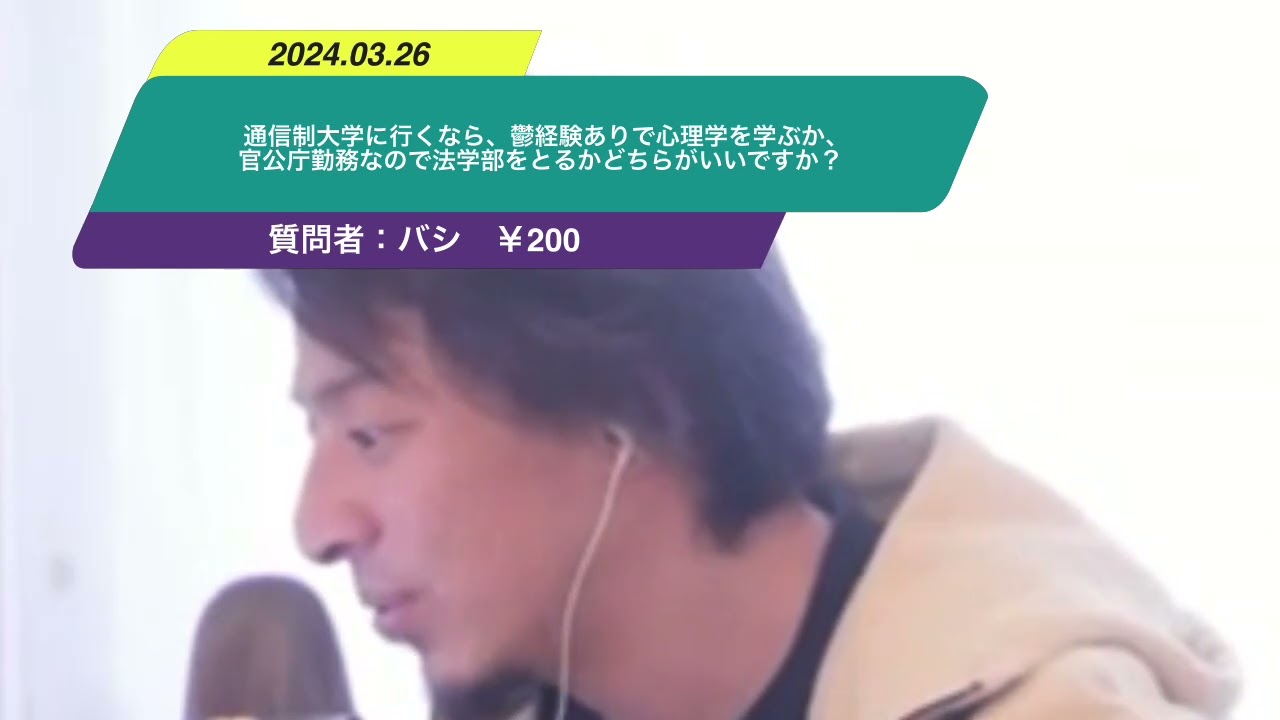 Kind: captionsLanguage: jaえ通信生大学に行くんならう経験ありで心理学を学ぶか観光長金部なので法学部を取るかどちらがいいですか法学部のが潰しが引きますよ理学別に何の潰しも引かないので