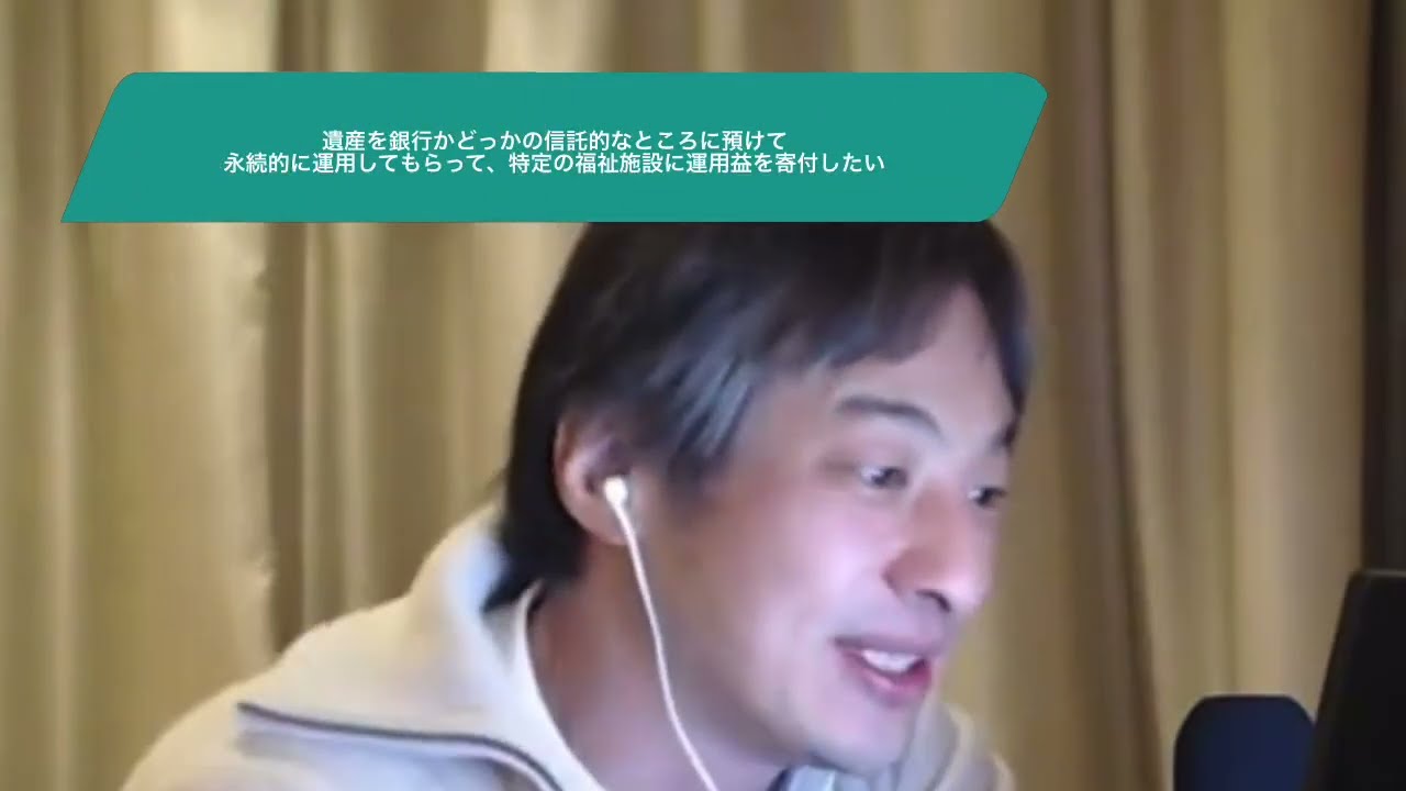 【ひろゆき】遺産を銀行かどっかの信託的なところに預けて永続的に運用してもらって、特定の福祉施設に運用益を寄付したいー ひろゆき切り抜き 20241227