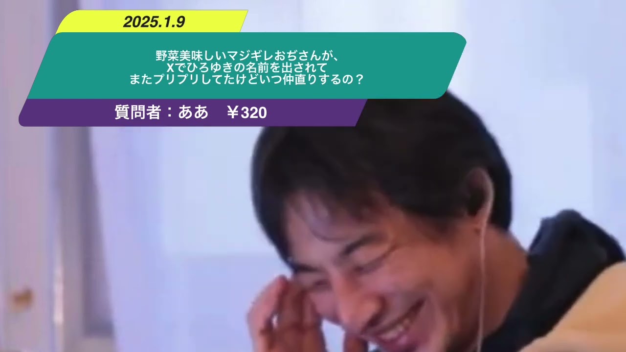 野菜美味しいマジギレおぢさんが、Xでひろゆきの名前を出されてまたプリプリしてたけどいつ仲直りするの?