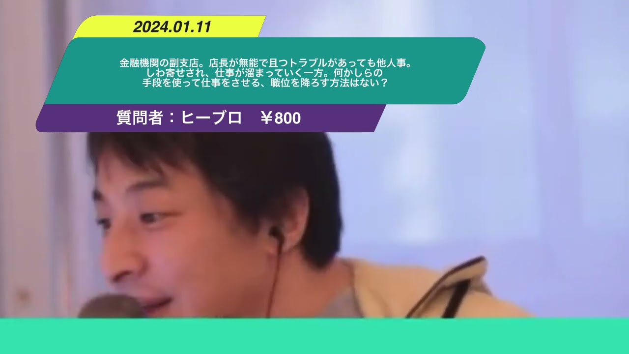 Kind: captionsLanguage: ja[音楽]え金融期間の福祉店長しております店長が無能でかつトラブルがあっても一言です全てこちらに業務が幸せされ仕事が溜まっていく一方です鉱石だけは持っています何かしらの手段を使って仕事をさせるまたは食よろ方法はないんでしょうかサボればま結局その鉱石を店長が持ってかれるんだったら鉱石が店長に行くんだったらやらないっていうので自分に鉱石が運ないんだったらやらないっていう形で他の職員にた人タッグを組んでやればいいんじゃないかなと思いますけどもY