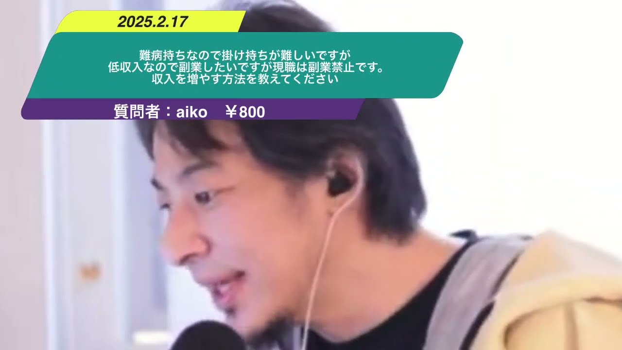 Kind: captionsLanguage: jaえ何病持ちなのが掛け持ちが難しいですが低収入なので副業したいですが原職は副業禁止です収入を増やす方法を教えてくださいうーん生活方法でいいんじゃないあの結局あの多分能力がそんなに高くなくて家でできる仕事というのは基本的にそんなに高い給料にならないんですよでさらに副業禁止で低収入のではそこでなんとか暮らさなきゃいけないっていうのなんですけどでそこの低収入というのが本当に引き金額だと生活保護をもらいながらあのその仕事をしてお金もらうってできるんですよね要はあの生活保護って全く仕事をしちゃいけないっていうわけじゃなくてもらってる金額は生活保護の支給額から減らすよっっていうのだったりするんですねえとあの例えばじゃあえっと質問をしますえっと今あなたが10万円昇給されますっていうのと半年後に50万円昇給されますどっちがいいですか要は今この瞬間10万円昇給されますなので今月の給料からあの10万円昇給それか半年後に50万円昇給されるどちらが得ですか[音楽]うんこれね結構ねコメントで半年後とか50万って書いてるんですけどあのこれ間違いで何が間違いかって言うと今昇級されて10万円でじゃあえっと2月で10万円増えました3月で10万円増えました4月で10万円増えました5月で10万円増ました6月で10万円触れました7月で10万円触れましたなので今10万増えると半年後には60万円増えてるんですよっていうので計算上でいくと実は半年後までに入る金額で高い金額って今10万円増えた方が得なんすよでもちろんその50万増えてその後会社に残るとかっていうのであればいいんですけどその後会社ってどうなるかわかんないじゃないですかだんで50万消されましたって言ってでその時にでもうちの会社なくなるんだよねでも50万円分はげよって言ったとしても50万円はもらいましたとでそこでじゃあ転職しましたってなったら結局意味ないじゃないですかなのでその状況がどうなのかっていうのでいくと実は今手に入る10万円もらった方が得っていう場合があるんですよねでこれがさっきのその行政初心に頼むかどうかあ車両師に頼むかどうかって話もそうでなのでその自分でやった方がコストが安いよねなのであと要は自分で3ヶ月後に自分でやってお金をもらうのか今からお金をを払って今からもらうのかでどっちのが得なのか要するにそのなんとなく他人に頼んだ方が損するよねって思うんですけどでも実際に今すぐもらえるんだったら他人にコストを払ってやった方が得する場合もあるんですよなんでこれってそのまあ人によって違うし情況によっても違うんですけどただその要はコストお金を払うというのが必ず損するっていう風に結構思う人っているんですけどそのキャッシュフローの概念で考えるとあれでも今すぐやってもだったらこれキャッシュフロー的にはこれだけ作れるよねっていう風に考えたりできるのでなのでどっちが得なのかっていうのは結構状況によって違うのでなのでお金を払った方が実は得する場合というのもあったりしますはい