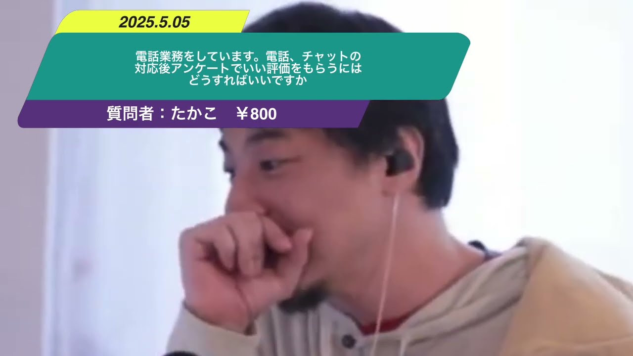 電話チャットの大木アンケートでいい評価をもらえどうすればいいですか?あの、こっちのフランスとかだと電話した後に、あの、この後の電話切った後に後で評価のやつ流れるから5言っといてとかっていうので普通にあの、高評価お願いしますみたいな話をカスタマーサービスの人が知ってたりするので、なのでそれをすればいいんじゃないかなと思います。