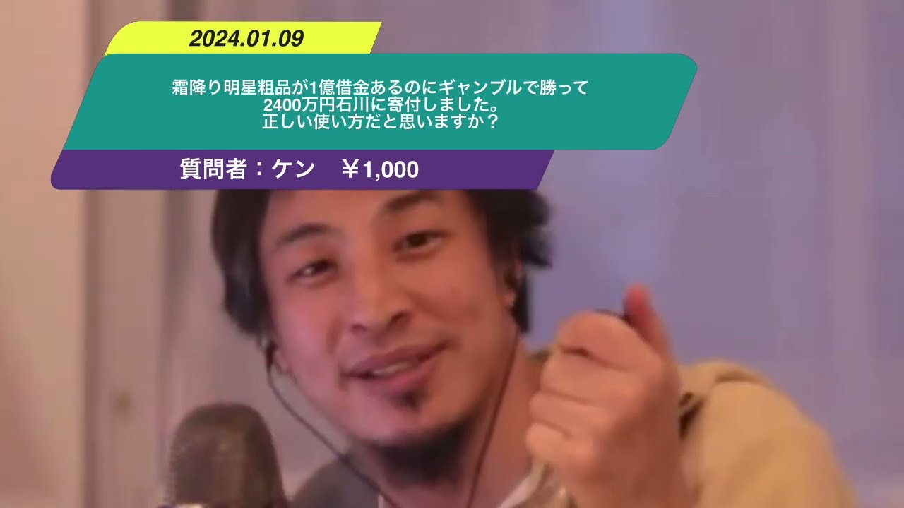 霜降り明星粗品が1億借金あるのにギャンブルで勝って2400万円石川に寄付しました。正しい使い方だと思いますか?
