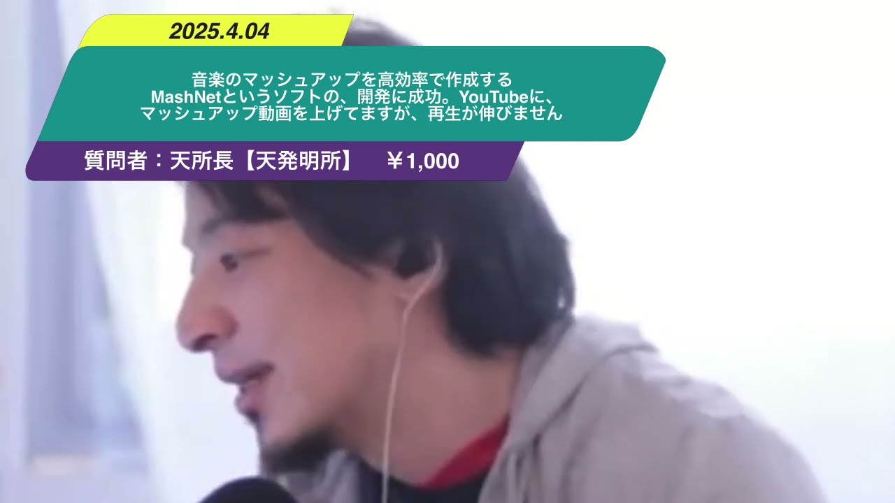 天発明所の天所長と申します。音楽のマッシュアップを高効率で作成するMashNetというソフトの、開発に成功しました。現実に音楽は無限にあるので、ビジネスの可能性も無限大です。YouTubeに、マッシュアップ動画を上げてますが、再生が伸びません。どういう戦略でMashNetの能力を活かすべきでしょうか?音楽界に革命を起こすだけの、可能性は秘めています。