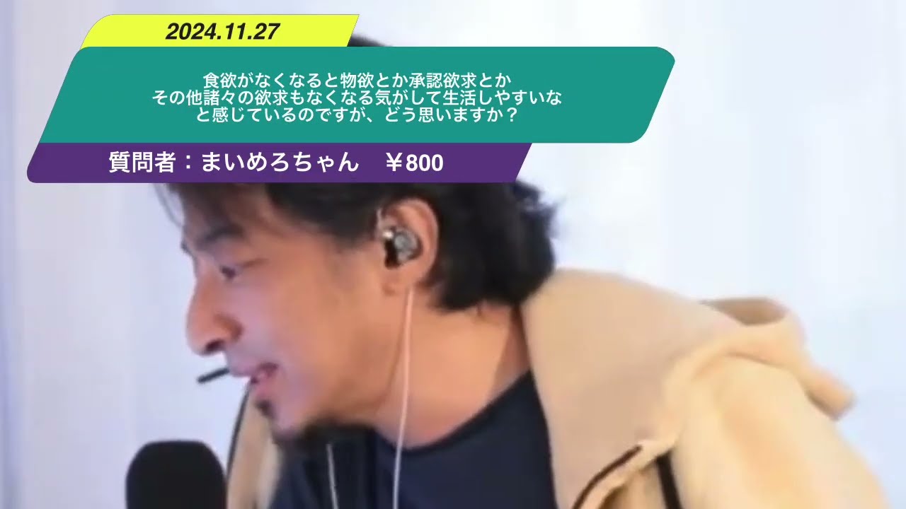 ひろゆきさん!今年の目標貯金額達成したのと、ダイエットで目標体重達成したので褒めてもらいたいです!♡ 食欲がなくなると物欲とか承認欲求とかその他諸々の欲求もなくなる気がして生活しやすいなと感じているのですが、どう思いますか?