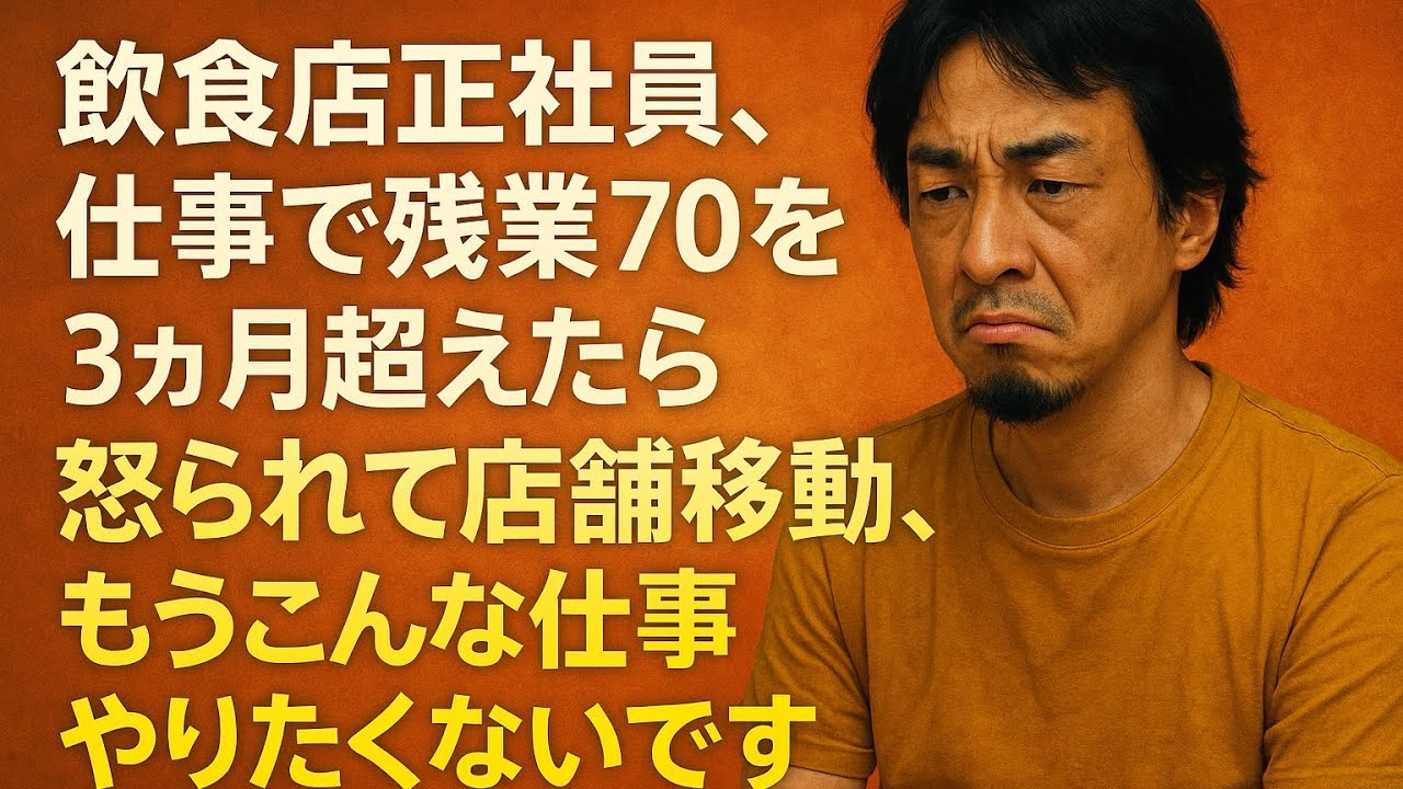 29歳男です 飲食店正社員です、仕事で残業70を3ヶ月超えたら怒られて店舗移動されました、もうこんな仕事やりたくないです。人生すごく嫌になってしまいました、こんな僕にひろゆきさんからの言葉お待ちしております。