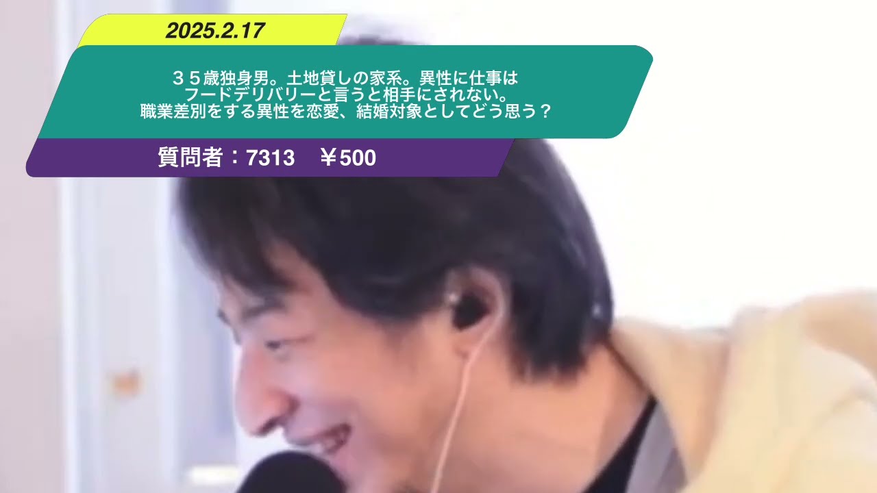 35歳独身男です。土地貸しの家系でフードデリバリーしながら自給自足的な生活してます。異性に仕事はフードデリバリーと言うと呆れられ相手にされません。女性を見極める良いフィルターになると思ってますが、全く彼女出来ません。 職業差別をする異性を恋愛、結婚対象としてどう思いますか?
