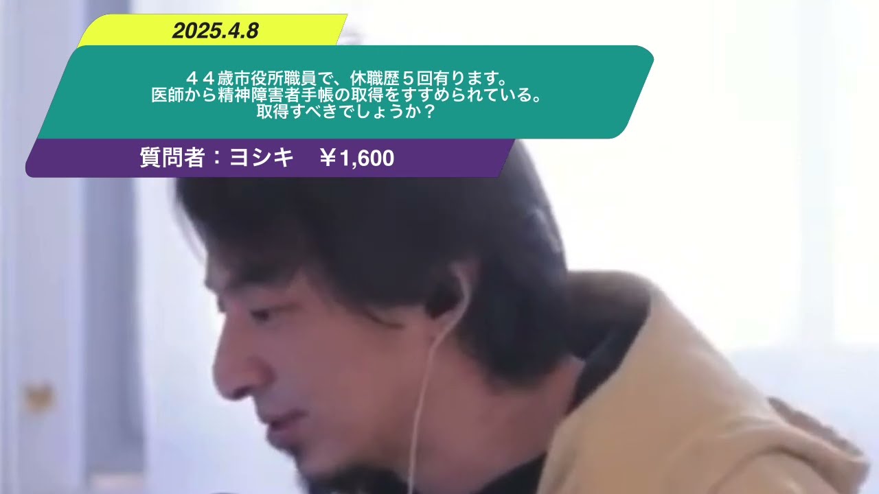 【ひろゆき】44歳市役所職員で、休職歴5回有ります。医師から精神障害者手帳の取得をすすめられている。取得すべきでしょうか?ー ひろゆき切り抜き 20250408