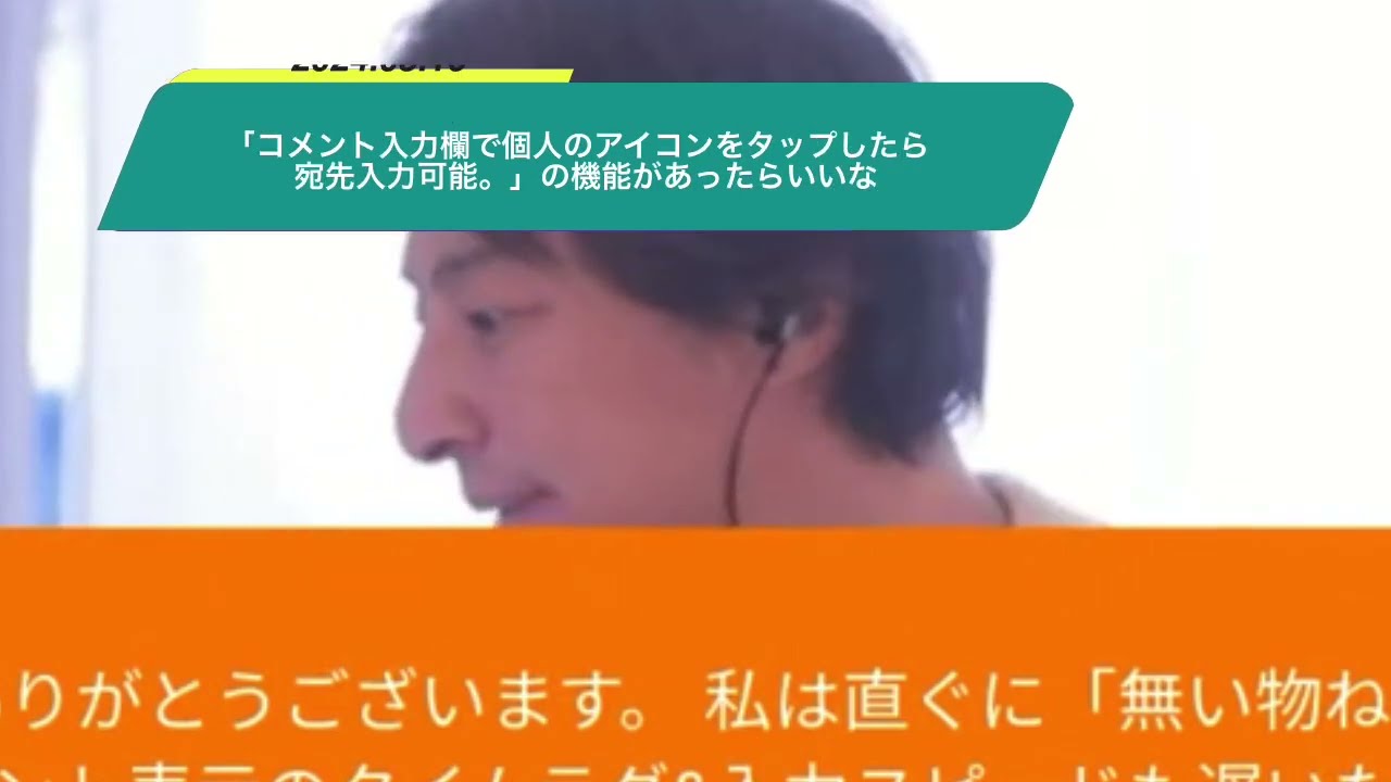 今晩わ!いつもありがとうございます。 私は直ぐに「無い物ねだり」をしてしまいます。 前回のLIVE配信で、コメント表示のタイムラグ&入力スピードも遅いため、意図していない投稿者の方へ不適切な言葉が表示されてしまいました。私は人を傷つけたいとは思わないのでこんな機能があったら良いなと思いました。 ①コメント入力欄で個人のアイコンをタップしたら宛先入力可能。 (他②~コメント欄に記載させていただきます)