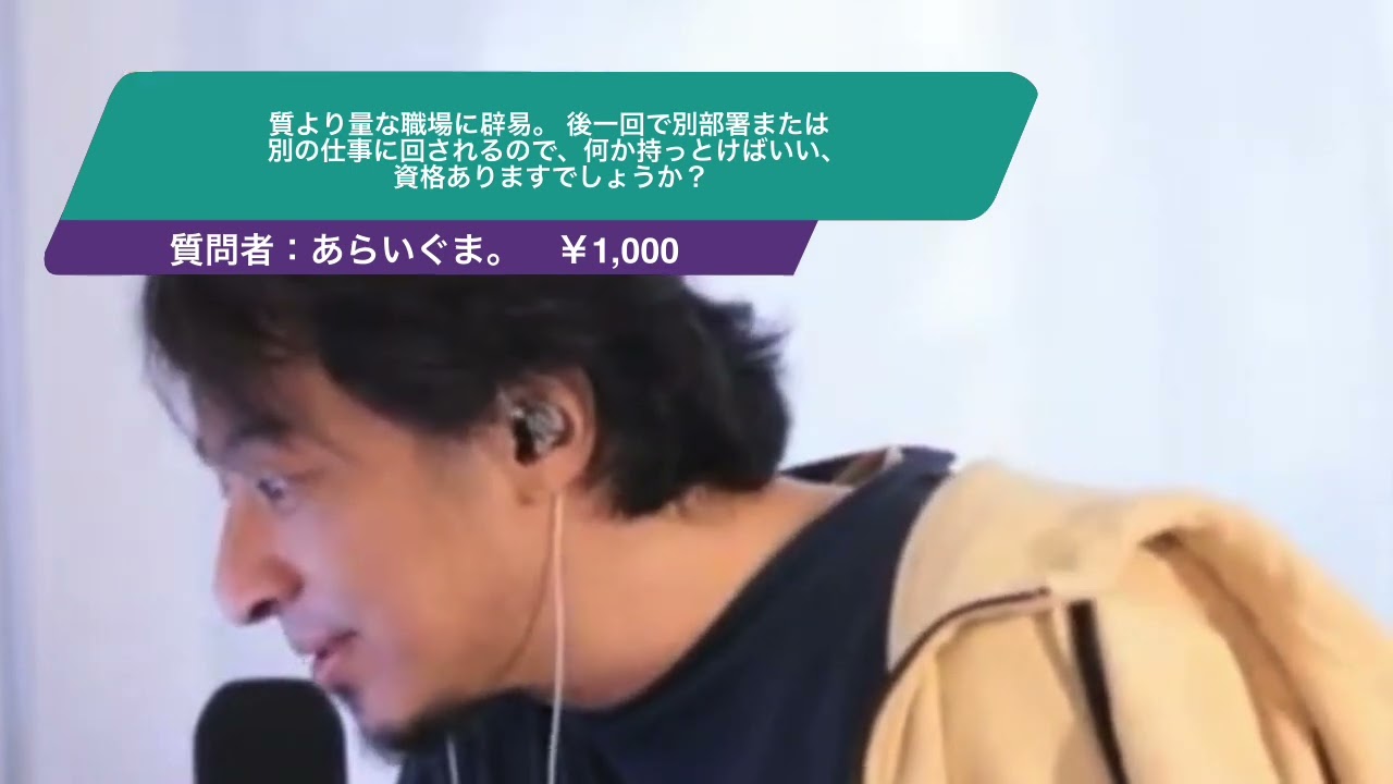 こんばんは!ひろゆきさんに質問です。 質より量な職場に辟易。 後一回で別部署または別の仕事に回されるので、何か持っとけばいい、資格ありますでしょうか?