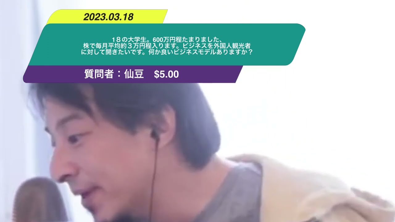 こんばんは、ひろゆきさん。18の大学生です。なんやかんやで600万円程たまりました、株で毎月平均約3万円程入ります;不安定。少ないですか、ビジネスを外国人観光者に対して開きたいです。何か良いビジネスモデルについてのインスピレーションを教えていただけないでしょうか?ありがとうございます。