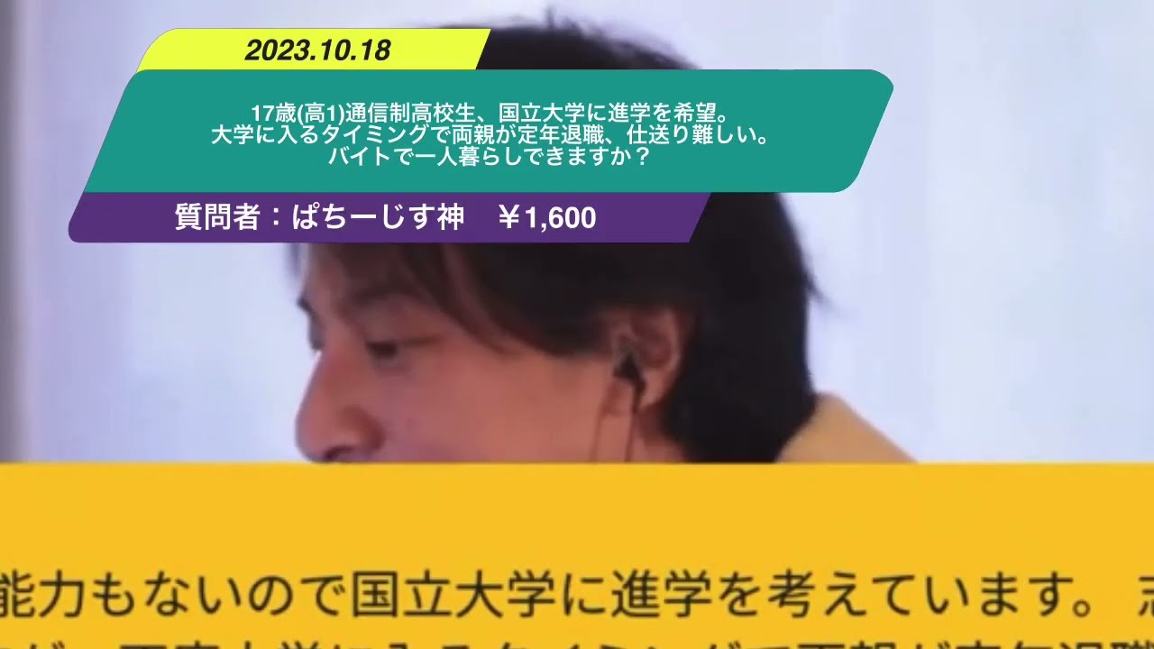 【ひろゆき】17歳(高1)通信制高校生、国立大学に進学を希望。大学に入るタイミングで両親が定年退職、仕送り難しい。バイトで一人暮らしできますか?ー ひろゆき切り抜き 20231018