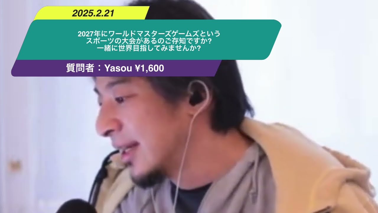ひろゆきさん こんばんは!もうすぐ万博ですが、2027年にワールドマスターズゲームズというスポーツの大会が関西であるのご存知ですか?1985年から続くれっきとした世界大会ですが、30歳以上でスポーツ好きであれば誰でも参加でき、参加後は「俺、世界大会出た」練習中は「俺、世界目指してる」と言える大会です。一緒に世界目指してみませんか?