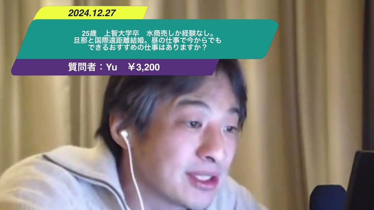 25歳 上智大学卒 水商売しか経験がありません。旦那と国際遠距離結婚をしているため長期で休みが取れない仕事は厳しいです。現地で就職をしようにも経験者を募集している会社ばかりです。昼の仕事をしてみたいのですが今からでもできるおすすめの仕事はありますか? PS長年不眠症に悩まされていましたがひろゆきさんの配信を聴き始めてから不眠症が治りました。ありがとうございます。