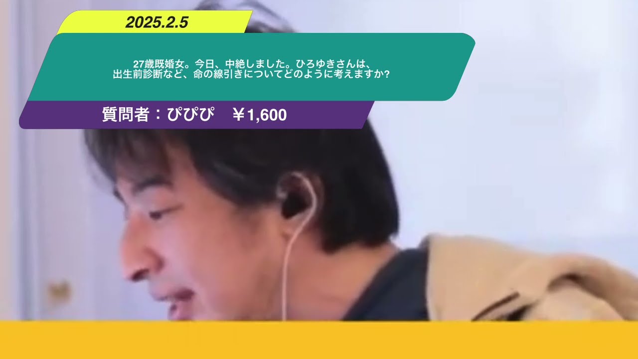 27歳既婚女。今日、中絶しました。昨年末に結婚した夫との初めて子供です、内服していた薬に催奇形性(健康な場合のリスク3%→内服で10%、現在は内服せず今後の妊娠に影響ないと診断)があり、今月海外旅行に行くことや、再就職を控えているため中絶でした。私はこれで良かったかな、と思うのですが、何となく後ろ髪引かれる思いです。ひろゆきさんは、出生前診断など、命の線引きについてどのように考えますか?
