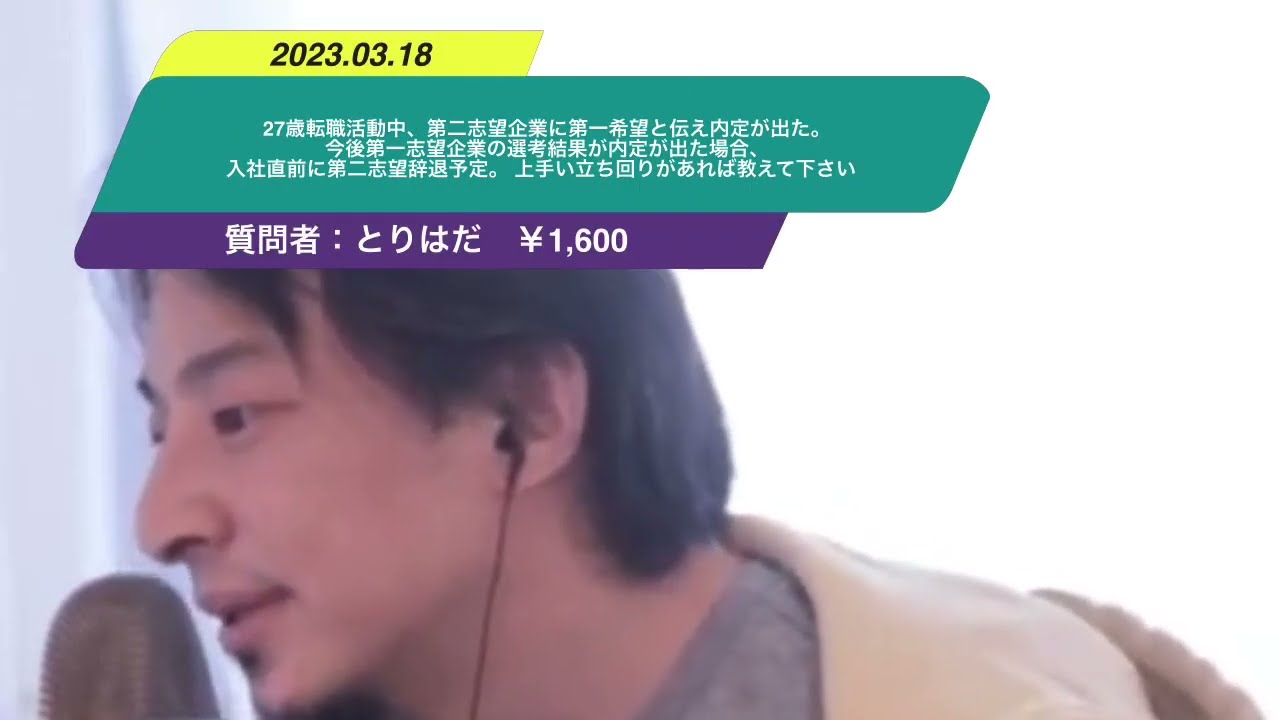 Kind: captionsLanguage: jaえ27歳転職活動中入社前日の内定事態について質問ですえ第2死亡企業から内定が出ましたが内定欲しさに本社が第1志望で4月から入社できますと伝えたため入社集諾書を来週出さなければいけません第1志望企業の先行結果は今月1泊から見込みで内定が出た場合入社直前に第2志望辞退するしかないのかな考えていますうまく計画できてたと思いますがこれからの馬に立ち回りがあればしてくださいぶっちゃけあの入社承諾書ってあのまその行きたいところ行ってごめんなさいって言っても法律的な問題になることはほとんどないんですよえっと一応そのモラル的な問題とかあのまあるんで一応そのなんか申し訳ねえなとか怒られたりとかあるんですけどでもま自分の人生なんであのそこはもう嘘ついてでも自分の好きな道を選ぶってのでいいんじゃないです