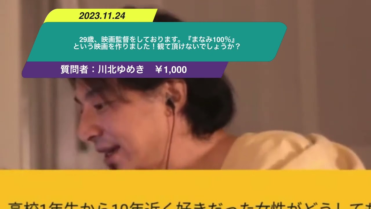 【ひろゆき】29歳、映画監督をしております。『まなみ100%』という映画を作りました!観て頂けないでしょうか?ー ひろゆき切り抜き 20231124